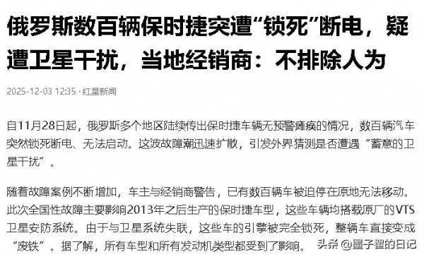 12月3日,俄罗斯数百名保时捷车主突然集体哀嚎,自己的百万豪车突然锁死断电、无法启动,全俄范围内上演"豪车变废铁"大戏。