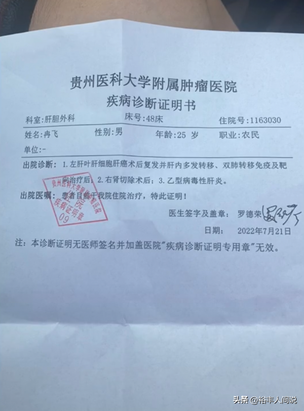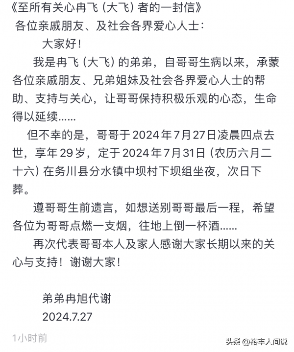 7月27号,抗癌网红圈传出悲痛消息,来自贵州的29岁大飞不幸因肝癌去世,他的弟弟悲痛分享讣告,并感谢那些帮助过他的好心社会人士。