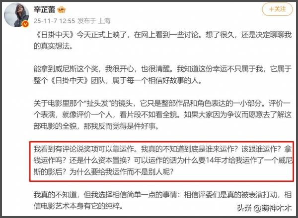 先简单了解一下网曝郝蕾朋友圈的内容,大致就是前半段内涵《狂野时代》能获戛纳电影节主竞赛单元评审团特别奖,是因为有人帮忙运作(撕奖)了,然后骂导演毕赣是妈宝男,后面还直接扫射辛芷蕾和白百何《春树》剧组风波,嘲讽辛芷蕾靠"扯头发"获奖。