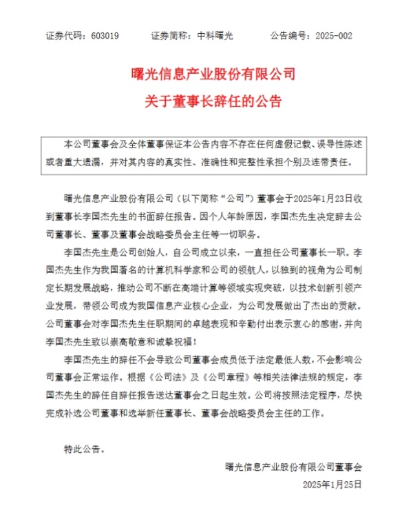 1月25日,曙光信息产业股份有限公司(下称:中科曙光)发布关于董事长辞任的公告称,曙光信息产业股份有限公司(以下简称"公司")董事会于2025年1月23日收到董事长李国杰的书面辞任报告。因个人年龄原因,李国杰决定辞去公司董事长、董事及董事会战略委员会主任等一切职务。