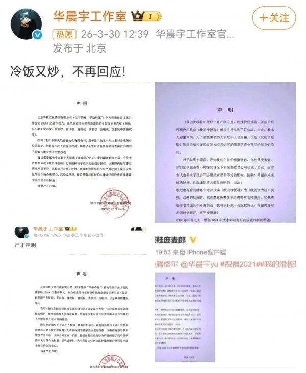 今天中午,@华晨宇工作室 晒出2019年的声明图,并配文,"冷饭又炒,不再回应!"