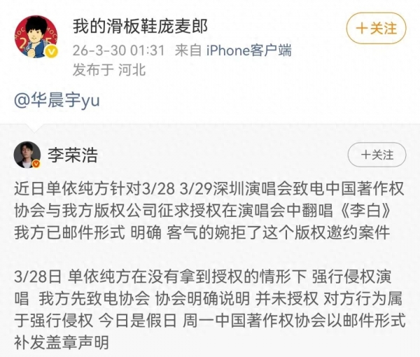 李荣浩公开喊话单依纯,称对方在婉拒翻唱授权的情况下,强行侵权演唱《李白》