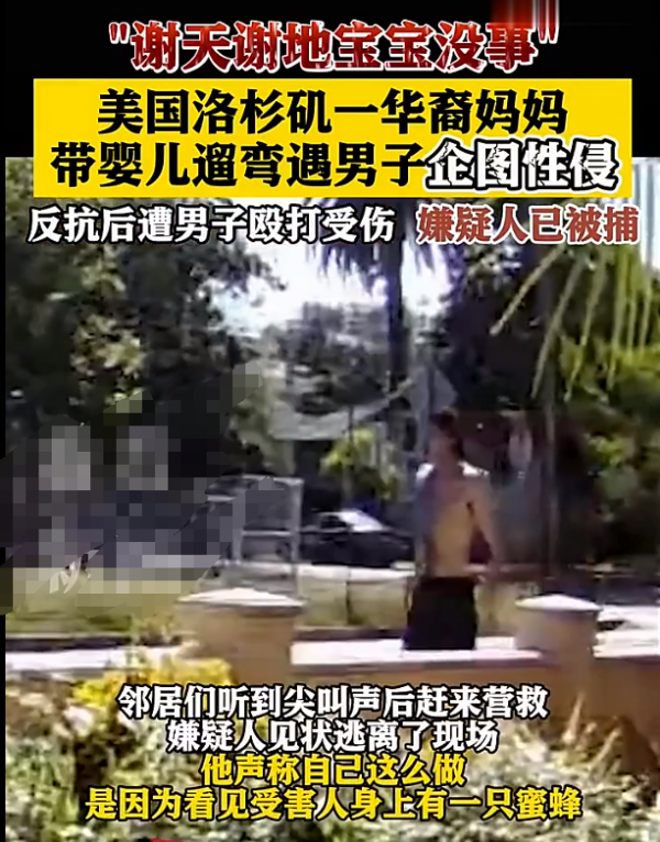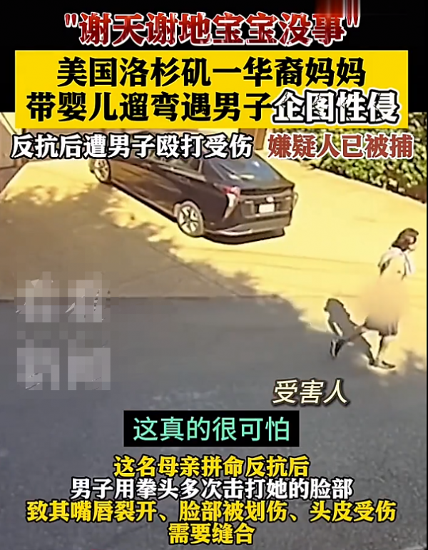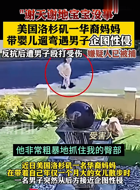 在美国洛杉矶,一位华裔妈妈带着刚满月的宝宝出门散步,结果遇到了一个变态男!这货不仅对人家动手动脚,还拳打脚踢!落网后变态男居然说