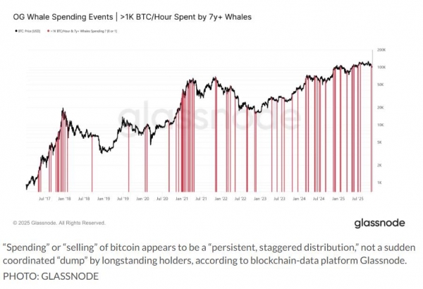 具体来看,持有比特币超过七年、每小时抛售逾1000枚的"巨鲸"钱包,其抛售行为在一段时间内呈现规律且匀速的特征(见下图,数据截至11月13日上周四)。