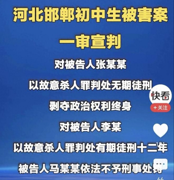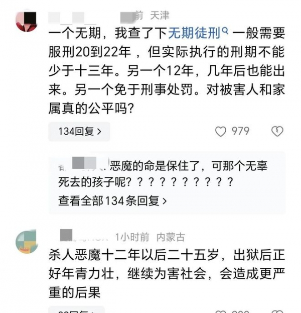 而有人则对这个判决结果有些失望,张某某被判无期,如果狱中表现好一点获得减刑,或许20年左右就出来了,而李某现年14岁,被判12年,出来时也不过26岁,正是年轻力壮的年纪,到时社会危害性会更大。