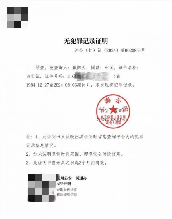 一份是由上海警方出具的无犯罪记录证明。