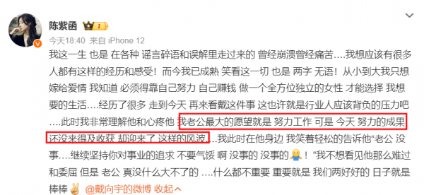她发文说她就是从各种谣言和误解中走出来的,知道遭遇谣言会有多崩溃痛苦,所以她现在非常理解戴向宇,心疼戴向宇。