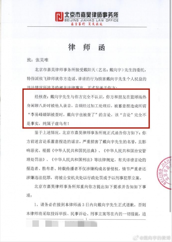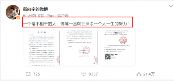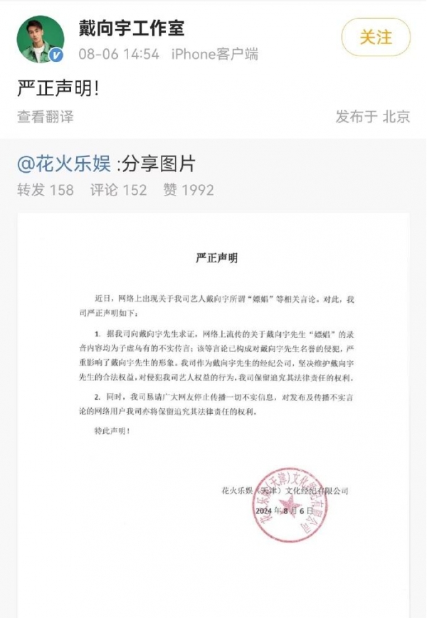 到了下午2点多,戴向宇工作室发布了严正声明,对于嫖娼一事进行了辟谣。