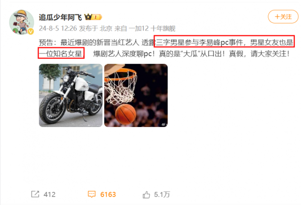 8月5日,狗仔阿飞爆料称一位爆剧新晋当红小生透露一名三字男星参与李易峰嫖娼事件,他的女朋友是一名当红女星,他还喜欢摩托车和篮球。
