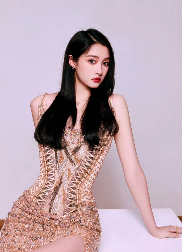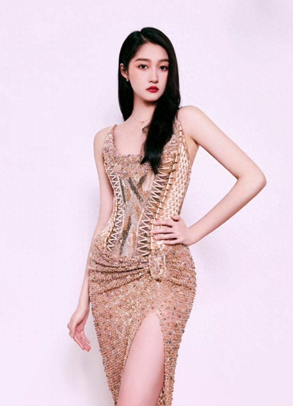 关晓彤一袭金色亮片吊带礼服,将好身材与大长腿的优势展现得淋漓尽致。吊带设计利落大方,衬出她精致的肩颈线条;腰部采用束腰式剪裁,搭配亮片交织的细节,紧紧勾勒出纤细腰肢,让身材曲线更显曼妙起伏。