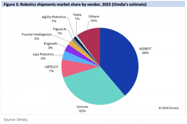 近日,全球顶级市场研究机构Omdia发布了《通用具身机器人市场雷达》报告。报告显示,2025年全球人形机器人总出货量定格在1.3万台,而来自中国上海的"独角兽"智元机器人(Agibot),以5,168台的年度出货量勇夺全球第一,斩获39%的市场份额。紧随其后的,是同样来自中国的宇树科技、优必选、乐聚、众擎、傅利叶。全球前六名,清一色全是"中国制造"。