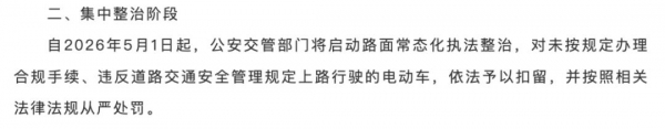 2026一开年,地区公安开展电动车交通安全专项整治工作,分两个阶段进行,从1月1日至4月30日为宣传公告及自主整改期,督促电动车车主依法完成车辆备案、登记上牌、驾驶证申领等合规手续。从5月1日起,将启动路面常态化执法整治,对未按规定办理合规手续、违反道路交通安全管理规定上路行驶的电动车,依法予以扣留,并按照相关法律法规从严处罚。