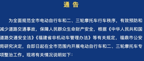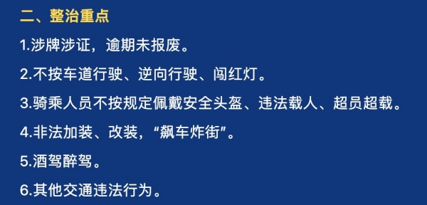 从即日起,全市范围内开展电动自行车和二、三轮摩托车专项整治工作,重点整治的违法行为包括涉牌涉证,逾期未报废;不按车道行驶、逆向行驶、闯红灯;骑乘人员不按规定佩戴安全头盔、违法载人、超员超载、非法改装等。