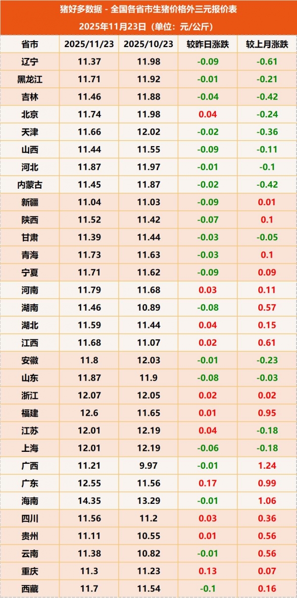 我们再来看一下最新的生猪行情走势。据猪好多数据监测显示,11月23日全国外三元生猪均价为11.76元/公斤,较昨日下跌0.01元/公斤,较月初高点下跌0.82元/公斤,月内至今跌幅6.52%,11月猪价的上涨预期大概率要化为"泡影"。