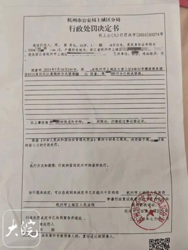 7月31日,发帖人李女士(化姓)在接受大皖新闻记者采访时表示:酒店房东因猥亵,被杭州市公安局上城区分局处以行政拘留七天的行政处罚。不过酒店与酒店房东至今未向其表达歉意,也未作出任何形式的赔偿。