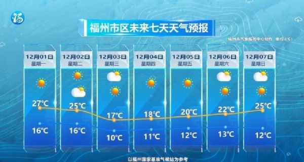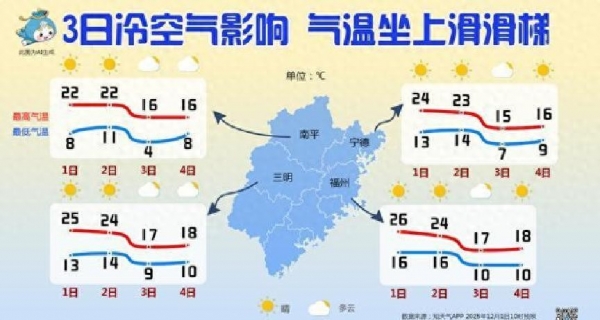 福州方面,冷空气预计3日到达市区。接下来几天里,白天还能见到晴天,但气温会明显下滑。具体到几点:今天下午到夜里晴,西北风3级,气温在27到16℃之间;2日白天到夜里晴转多云,东风3级,气温25到16℃;3日白天到夜里多云转晴,东北风4级,气温骤降到17到10℃;4日白天到夜里晴,东北风3级,气温18到11℃。也就是说,3日那天午后到晚上,市区温度会从二十多度一下跌到十七度左右,最低剩十度左右,换季的寒意会明显起来。