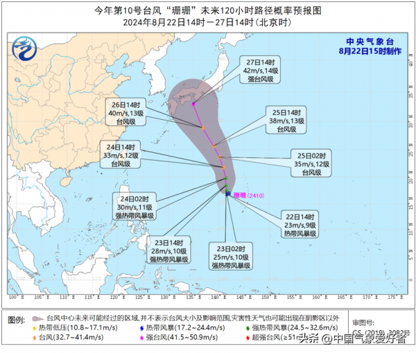 8月21日开始,台风胚胎90W中心对流持续爆发,核心云团变得越来越紧密,负责台风命名的日本气象厅在8月21日对其发布了烈风警报。8月22日凌晨,日本气象厅更是迅速宣布今年第10号台风珊珊在关岛西北方海域生成。根据日本气象厅命名后给出的预测,台风珊珊将持续向偏北方向移动,可能在8月27日前后接近日本南部沿海,这将是今年8月又一瞄准日本的台风。