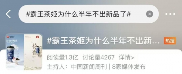 前几天,一则有关"霸王茶姬不上新"的新闻挂上微博热搜。据媒体报道,霸王茶姬已有半年没有推出新品,加盟商和消费者一个比一个急[3]。