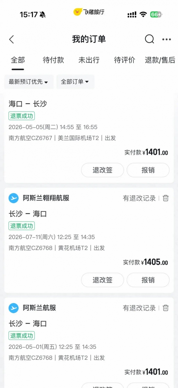 梁女士对于飞猪售后服务不满意,整个维权过程太耗费精力,不想再继续跟飞猪耗下去了,无奈之下把四张机票都退了。