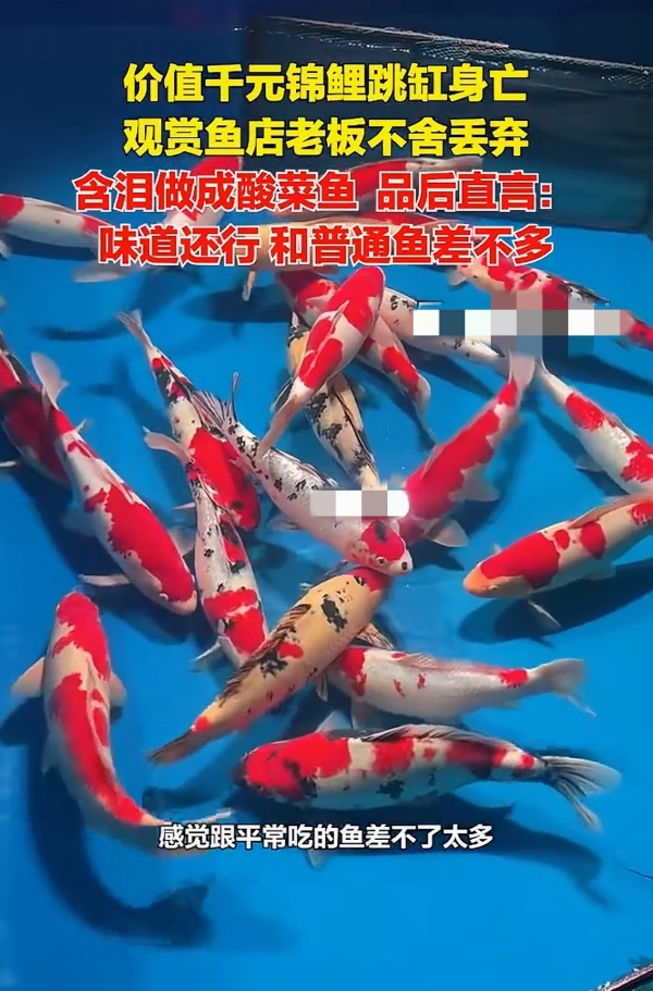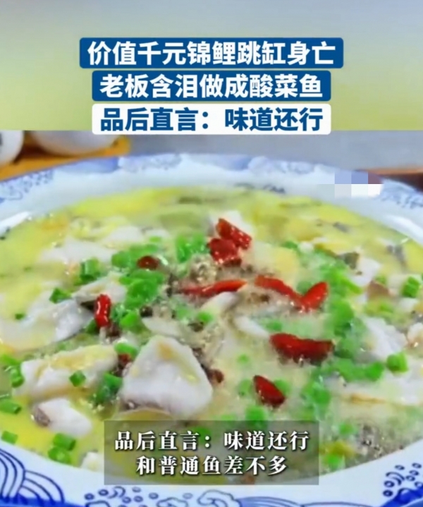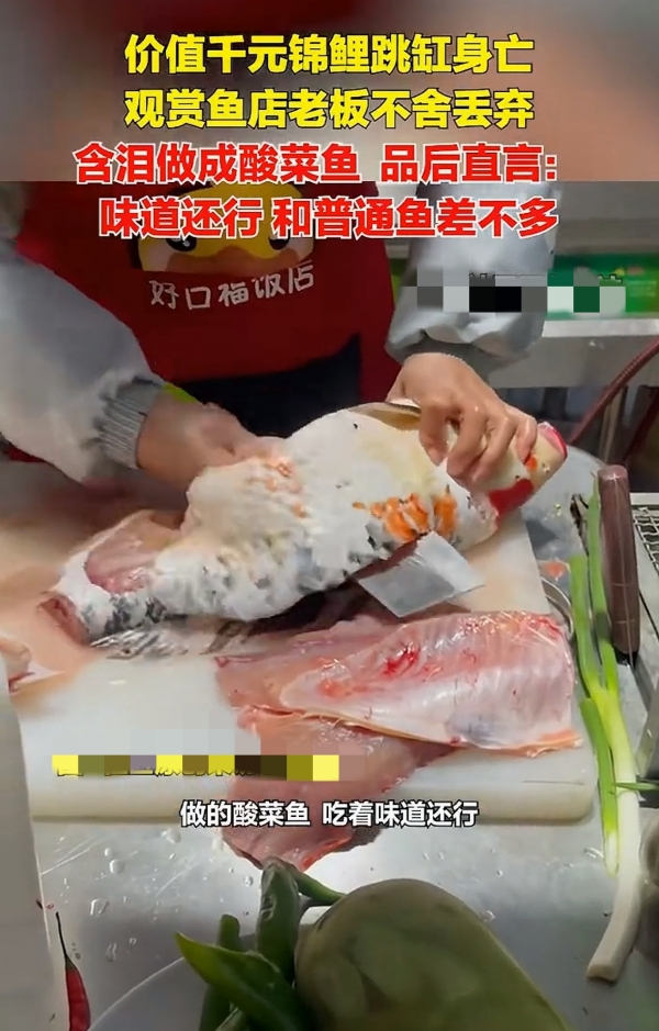 说实话,刷到这个视频的第一反应就是又好笑又心疼,这种哭笑不得的瞬间,简直是每个普通人生活的真实缩影。一千块钱的锦鲤,本来是用来赏玩、图个好兆头的,结果一场意外直接"跳缸自尽",老板也没有纠结值不值、怨不怨,而是用最接地气的方式止损--含泪做成菜,既不浪费食材,也把已经发生的损失,变成了一顿能下肚的饭。