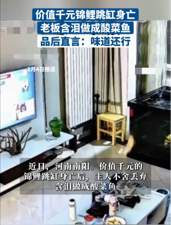 2月4日,河南南阳一家观赏鱼店闹出了又好笑又心酸的热门事:店里一条价值千元的锦鲤突然意外跳缸,等老板发现时已经没能救回来。看着这条花大价钱养的观赏鱼没了性命,老板既心疼又舍不得直接扔掉,纠结过后含泪把鱼处理干净,做成了一道酸菜鱼,尝完还直言"味道还行,和普通鱼差不多"。这段真实又反差的视频发到网上后迅速刷屏,网友们一边笑到捶桌,一边玩梗评论刷满评论区,成了近期最有烟火气的热点小事。