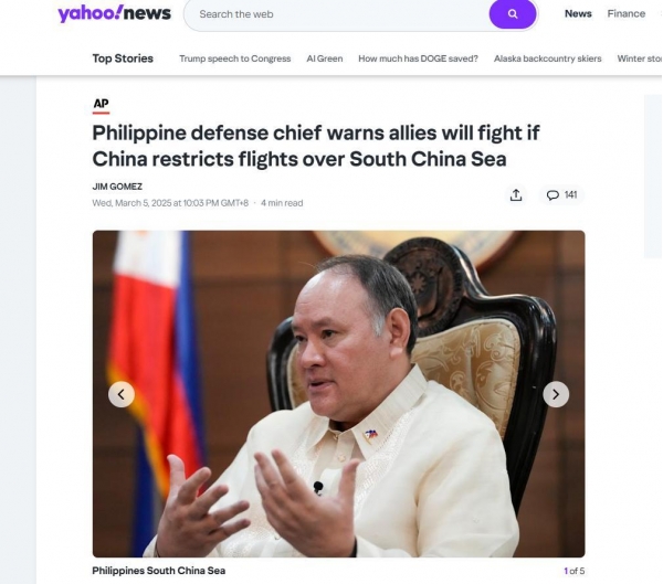 3月5日,菲律宾国防部长特奥多罗就抛出大议题--如果中国限制菲律宾及其盟友国家的"飞行自由"。那么菲律宾将联合盟友动用一系列手段应对中国的限制,包括直接发起战斗。
