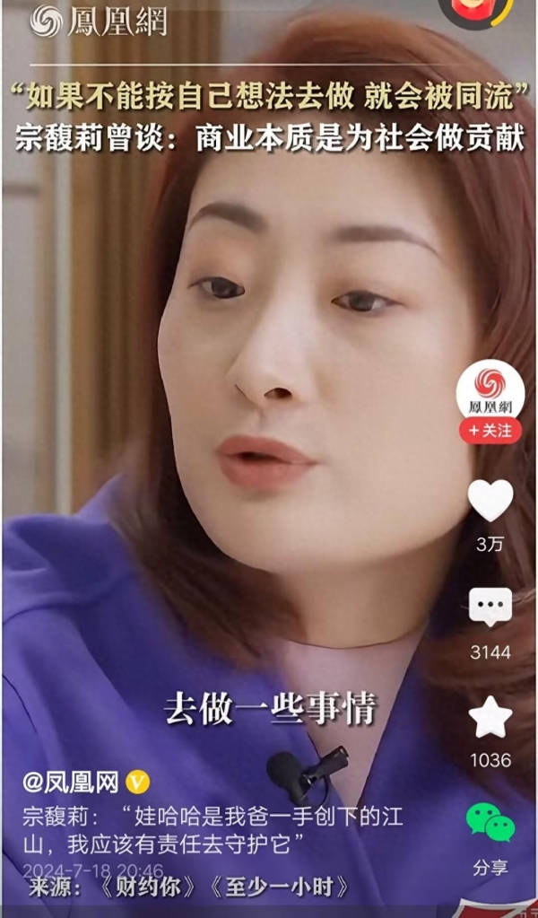 近日凤凰网放出宗馥莉此前的一段采访视频,她说:"如果说在这个时代,如果你没有按照自己的想法去做一些事情,就你很会被人家同流。然后同流的话可能就达不到自己想要的成就。就商业本质其实还是为社会做贡献,为普罗大众、为员工去谋他们的幸福。娃哈哈是我爸一手创下的江山,作为他女儿来讲,我应该有责任去守护它。"