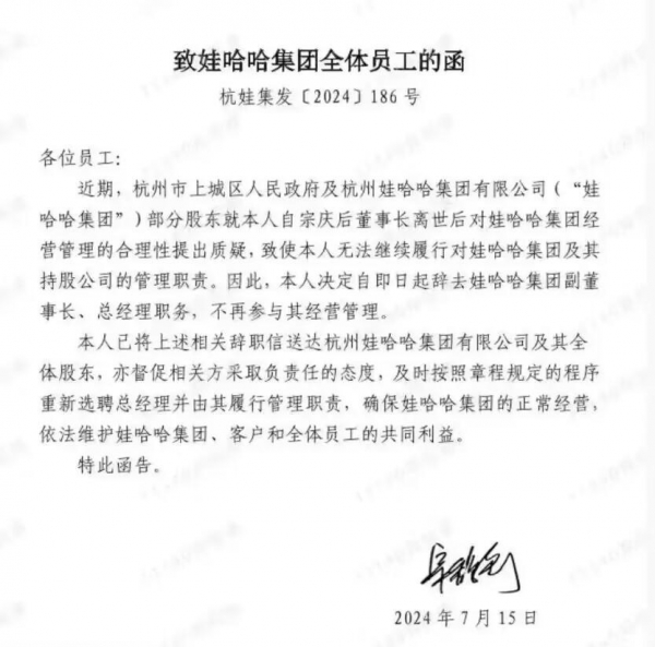而在网传的辞职信中宗馥莉提到,杭州上城区人民政府及娃哈哈集团部分股东对她经营管理的合理性提出质疑,致使她无法继续履行对娃哈哈集团及其持股公司的管理职责,因此决定辞去副董事长、总经理职务,不再参与其经营管理。