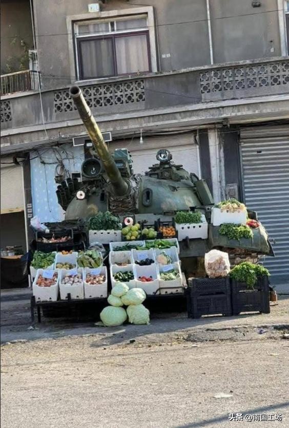 叙利亚政府军遗弃的坦克变成了卖菜的摊子