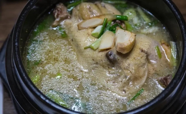 第三样是鸡汤。有"一九一只鸡"这种说法,意思是寒冬时节喝鸡汤既补营养又暖身,做法是用老母鸡,先把鸡切块放进冷水里煮开,撇去浮沫再捞出洗净,然后放回砂锅中加满清水,放几颗红枣和干香菇或鲜菌菇,小火慢炖至少一个小时,直到汤色变浓、肉质酥烂才出锅。南北方的做法有些差别,广东一带会在鸡汤里放银杏、参须等材料,汤清味鲜、不油腻,江苏等地喜欢清炖,尽量保持鸡的原味,喝热汤的好处不只是补充营养,汤里的水分也更容易被身体吸收,能帮人维持体温和舒适感,冷天里常喝热汤比喝冷饮好。