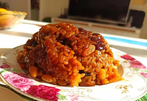 第四样是八宝饭,这道甜食把糯米的特点发挥到极致,做法是把糯米提前泡好,蒸到七成熟,准备好配料,年糕切片,红枣,核桃仁,葡萄干,莲子等,模具底部先摆好红枣或者糖色图案,把蒸好的糯米铺上,然后分层放各种配料,压实再蒸透,出锅后把饭倒扣到盘子里,表面淋上糖浆或者红糖水,色香味都合适,清代文献里就有用糯米制作御寒食品的记载,认为糯米有补气的功效,吃后容易觉得热乎,八宝饭一般过年吃,寓意着对来年丰收平安的期待,把糯米做成这样一盘,既可提供热量,又在家庭里形成一种仪式感。