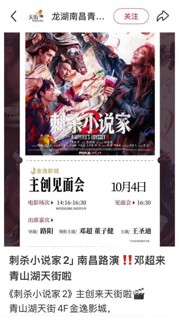 国庆期间,邓超还将来到江西南昌参加《刺杀小说家2》的路演活动。