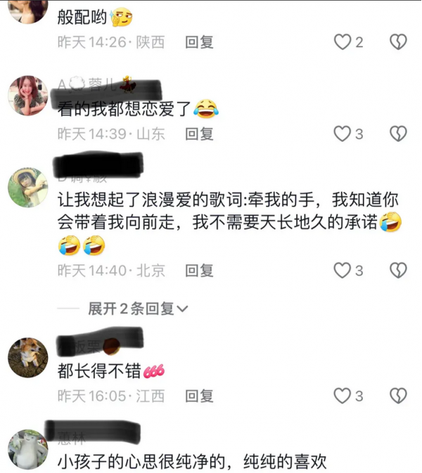 当然,网友们的评论也充满了幽默感。有的说:"男孩牵得这么熟练,未来肯定是个高手。"有的调侃:"女孩的表情就是传说中的'小迷妹',被幸福冲昏了头脑。"更有网友玩笑:"女孩爸爸已经拿着棍子在来的路上了。"这些评论让整个事件在温馨之外,又多了一点人间烟火的气息。