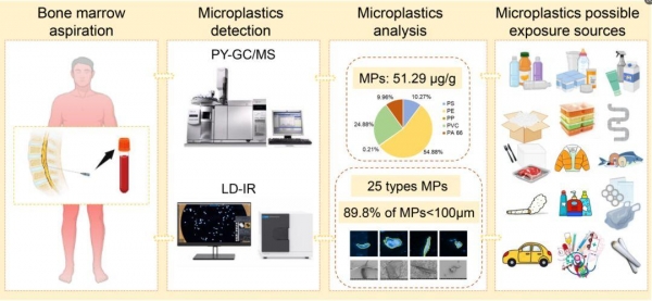 该研究团队通过热裂解-气相色谱-质谱联用法(Py-GC/MS)检测骨髓样本中微塑料(MPs)的浓度,并通过激光红外成像光谱(LD-IR)和扫描电子显微镜(SEM)评估MPs的尺寸范围和形态特征。