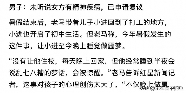 小进的爸爸表示,这件事给孩子造成了巨大的心理创伤,他变得不爱说话,晚上会做噩梦惊醒。