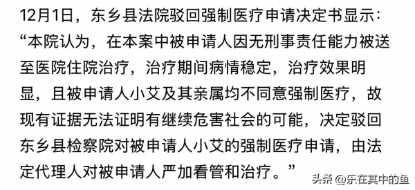 法院驳回了对小艾的强制医疗申请,理由是她目前已不具有人身危险性,由法定代理人带回家中严加看管。