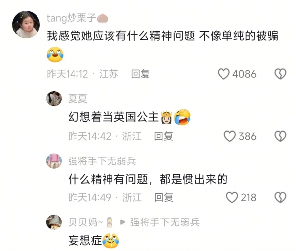 但是很显然,这位31岁的女子,正陷入自己编造的爱情中不可自拔了,还扬言,父母不同意的话,她要去英国找婆婆,跟婆婆一起住。