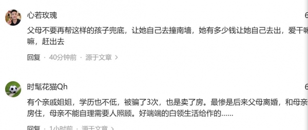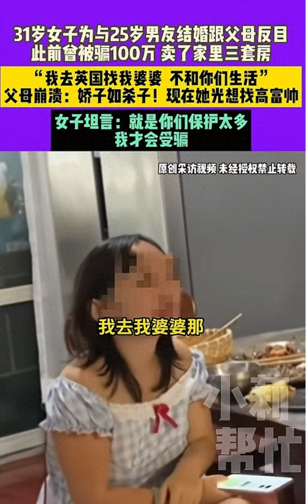 父母对记者说,自从一个人在珠海生活回来后,就变了,她整天想找高富帅,自从谈恋爱后,已经被骗了100万,还卖了3套房。