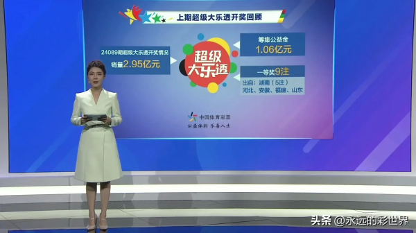 上期大乐透开奖数据回顾:第24089期全国销售总额2.95亿元,募集公益金1.06亿元。一等奖中出9注,具体出自:湖南5注、河北1注、安徽1注、山东1注、福建1注。