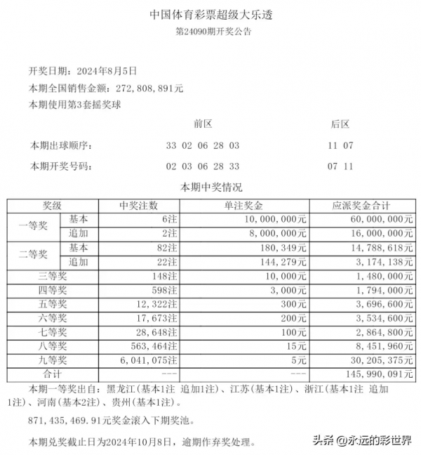 计奖后8.71亿元奖金滚入下期奖池;本期兑奖截止日为2024年10月8日,逾期作弃奖处理。