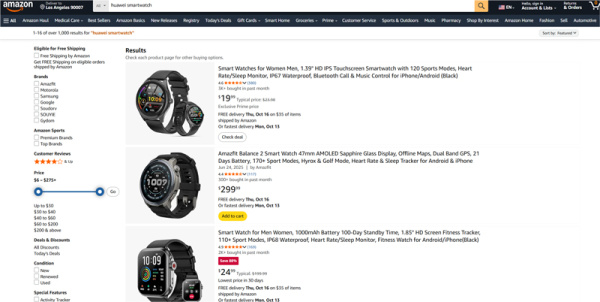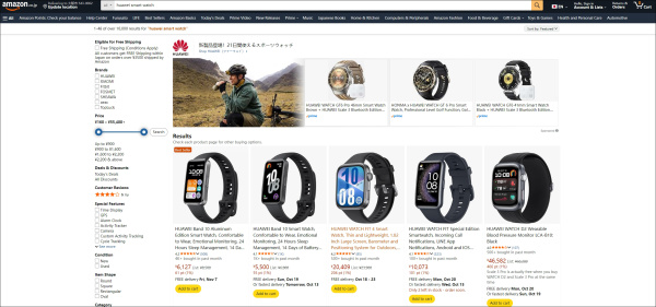 目前在亚马逊网站上,若将地址定位在美国境内比如洛杉矶,搜索"华为智能手表"只显示了其他品牌智能手表(如下图1),搜索"华为"也无法搜到华为的智能手表产品(如下图2),只显示了相关品牌手机。但若把地址定位到美国境外比如日本,仍能搜索到智能手表(如下图3)。