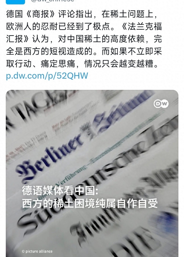 最近德国媒体声称,欧洲对中国稀土出口管制的忍耐已经到了极点,还放话要是中方不放松限制,欧盟可能会启动制裁。