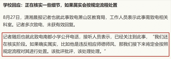 后记者联系上事发小学学校,学校接线员称:他们已关注到此事,但还在核实阶段。如果属实带批评批评,该处罚处罚!正在按流程处理!