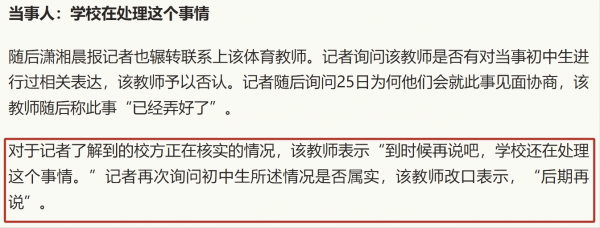记者联系上当事人,体育老师,体育老师回应:到时再说吧,学校还在处理这件事。