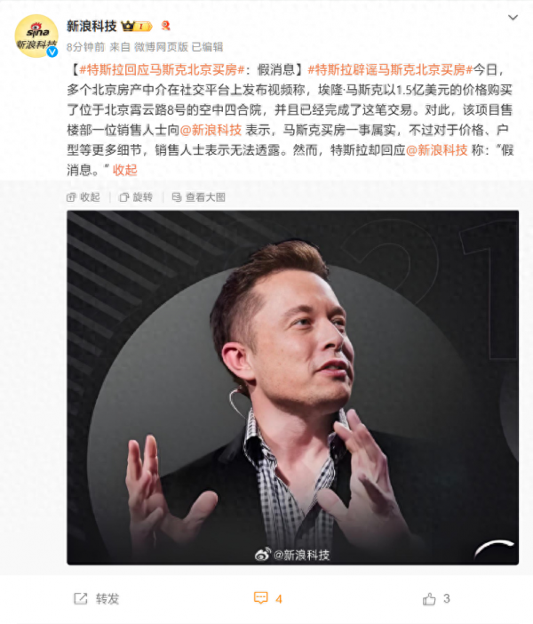 IT之家 9 月 5 日消息,今天有多个北京房产中介在社交平台上发布消息称,特斯拉 CEO 埃隆・马斯克以 1.5 亿美元(IT之家备注:当前约 10.67 亿元人民币)价格购买了位于北京霄云路 8 号的空中四合院,并且已经完成了这笔交易。针对上述传闻,特斯拉回应新浪科技称:"假消息。"