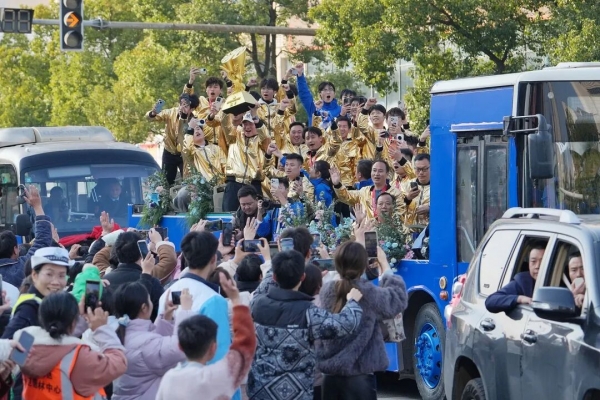 △"湘超"冠军永州队回到湖南永州,球员们乘公交花车亮相。(图/杨华峰/中新社湖南分社/视觉中国)