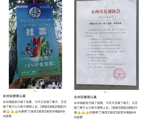 永州队首个主场比赛时,门票很快被抢光,有网友调侃要买"挂票",爬上体育场四周的大树观赛。没想到,永州市足协竟然真的发布了《"树上挂票"使用指南》,明确规定每棵树限3人,禁止倒吊观赛,严禁携带蟒蛇、眼镜蛇、五步蛇观赛。官方下场玩梗,将城市的运动热情推向高潮。