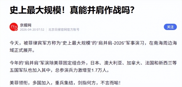 4月20日,美菲牵头搞了个"肩并肩-2026"联合军演,号称史上最大规模,凑了1.7万人。