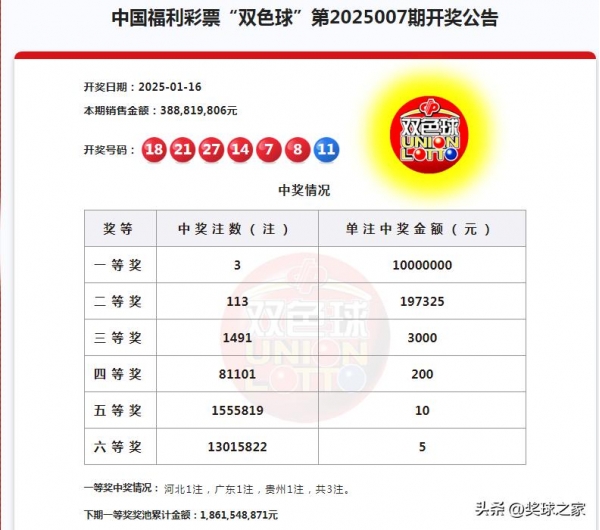 双色球25007期中奖情况:本期一等奖开出3注,每注奖金1000万。花落三地, 河北1注,广东1注,贵州1注,共3注。