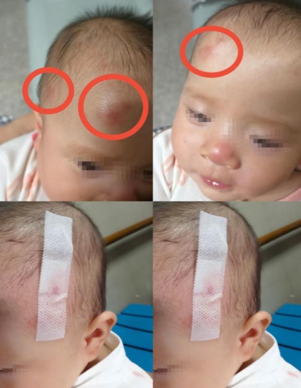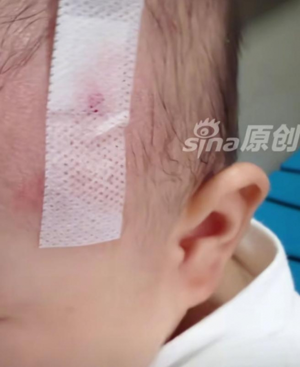 这次事故带来的伤害,比表面看到的严重得多。当天宝宝头上好几处都红肿了。孩子后脑勺着地,宝妈赶紧抱着孩子去当地县医院检查。